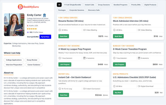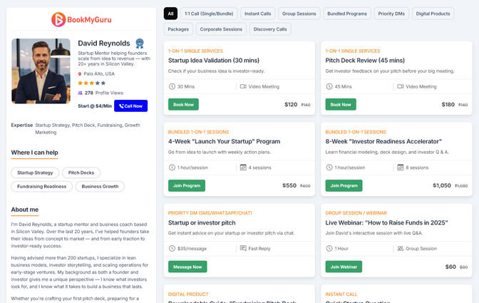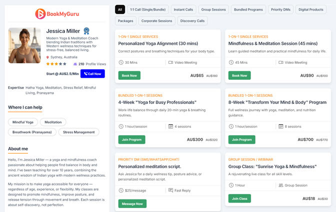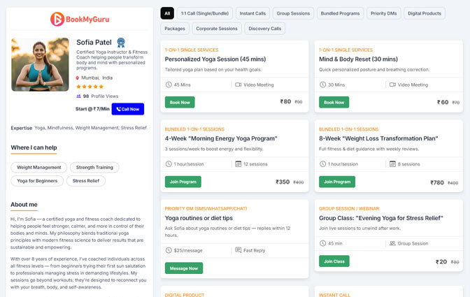 BookMyGuru helped me package my services into 6-week programs and reach students far beyond my city. The built-in scheduling and payments make everything effortless!