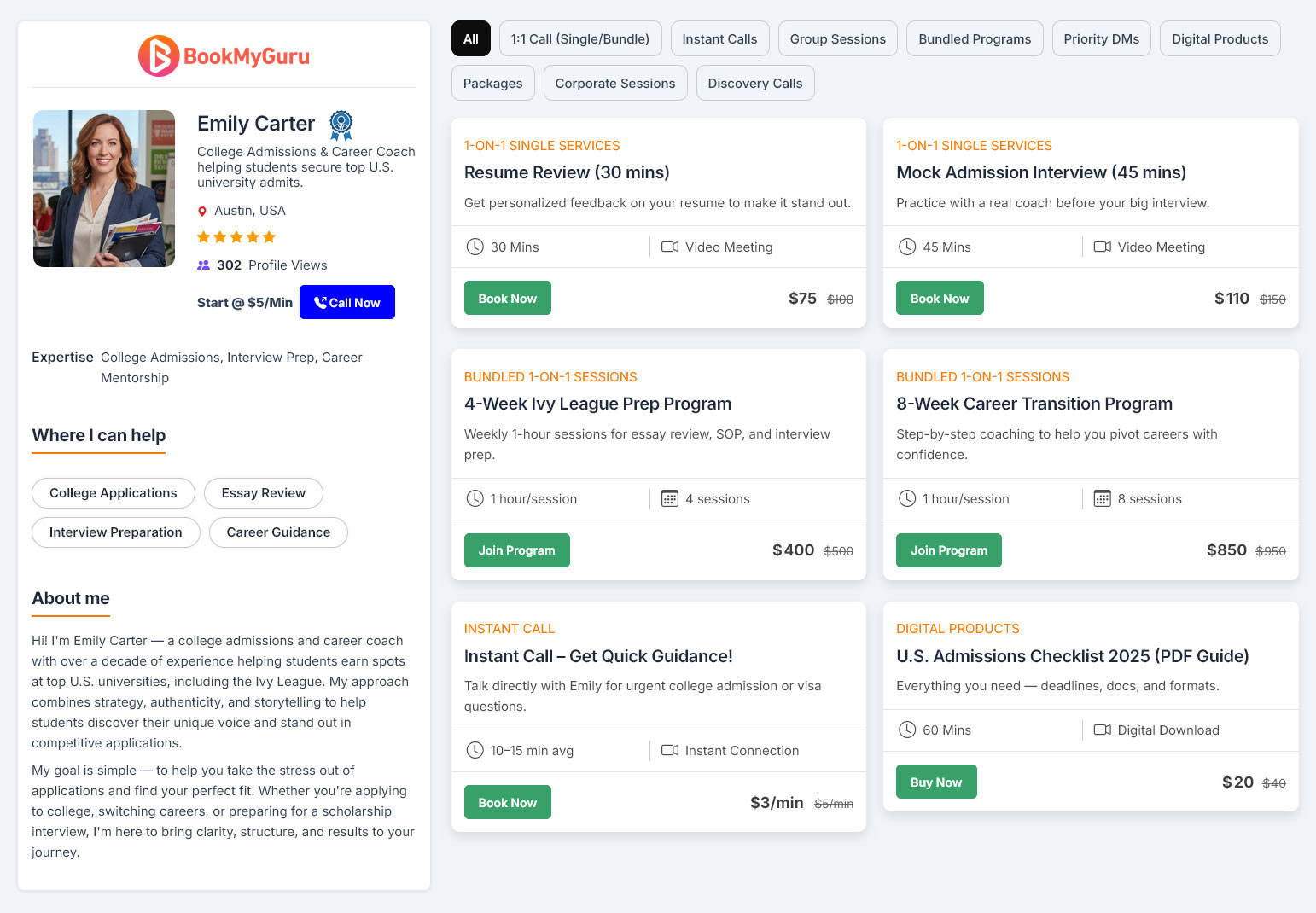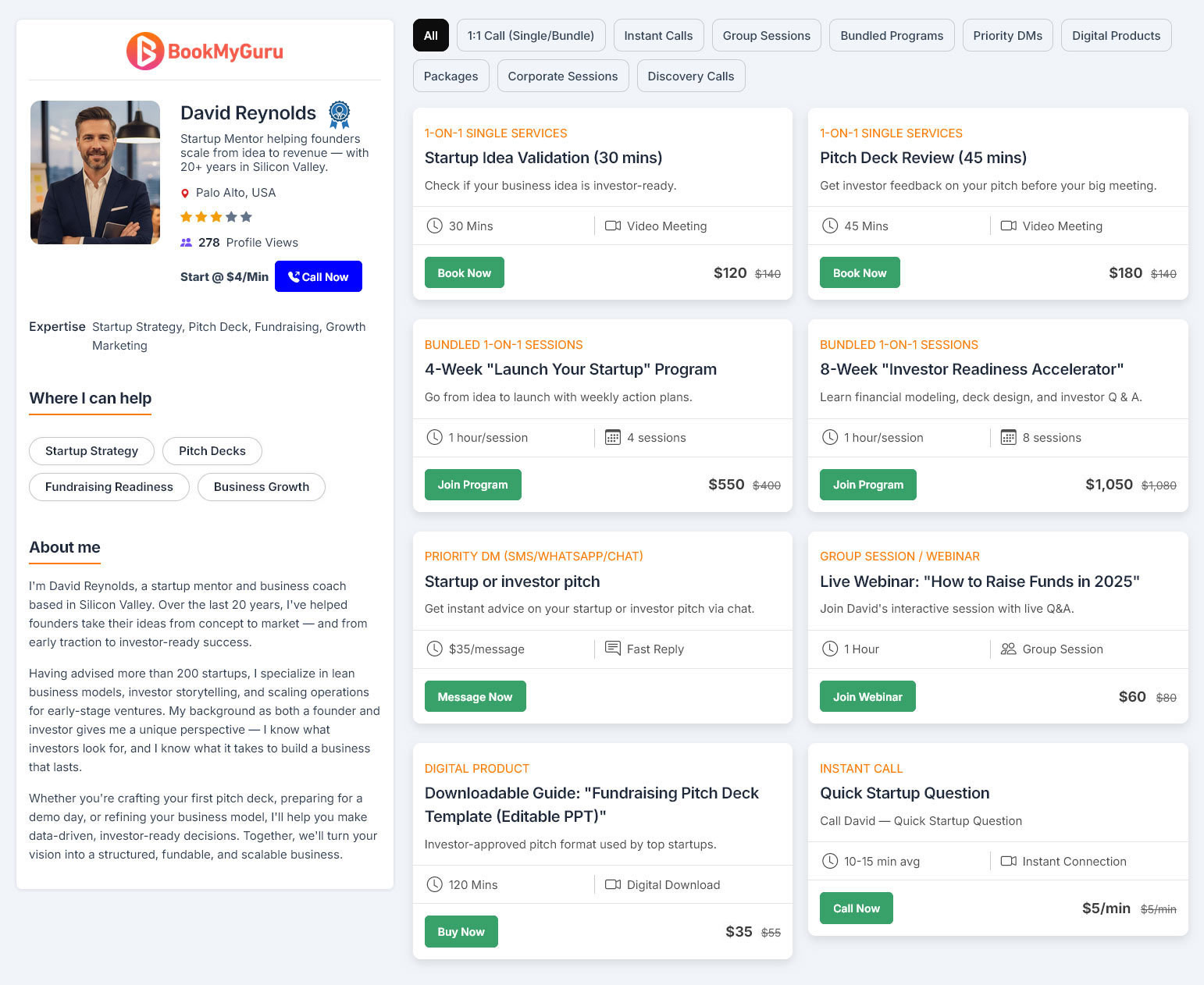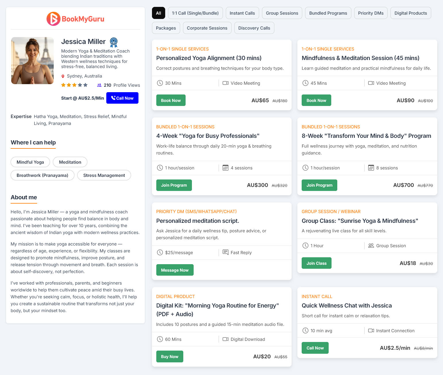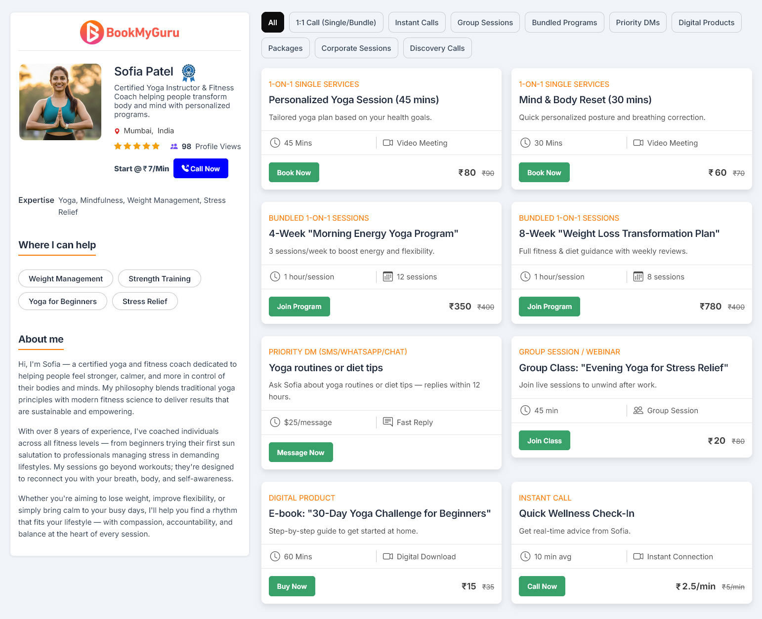 Built-in Exposure:Appear in trending categories, featured listings, and BookMyGuru campaigns.