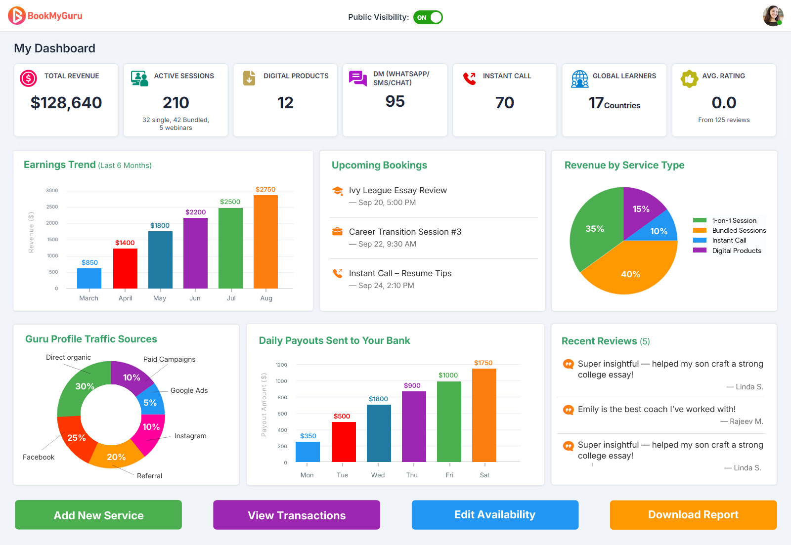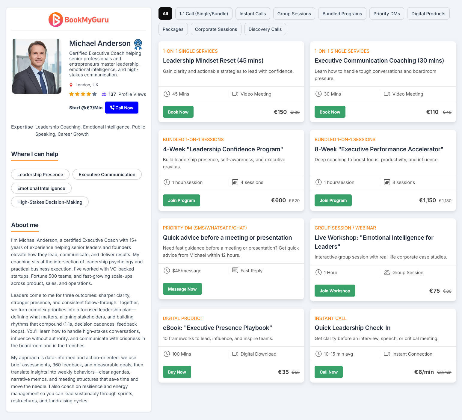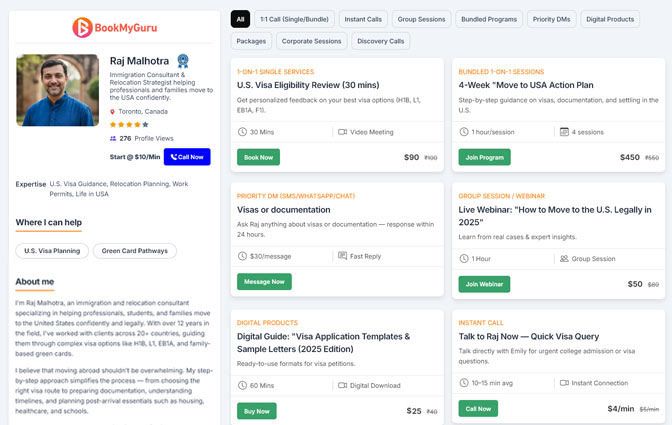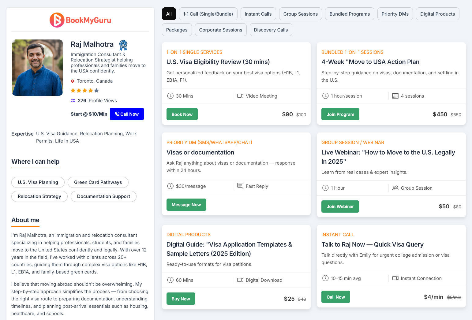 Built-in Exposure:Appear in trending categories, featured listings, and BookMyGuru campaigns.