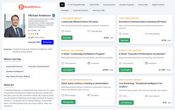 BookMyGuru isn't just another creator tool - it's a global marketplace that connects you with new learners, clients, and fans searching for experts like you. You're no longer limited to your YouTube subscribers or Instagram followers - our smart search and category-based discovery engine brings you clients you've never met before.