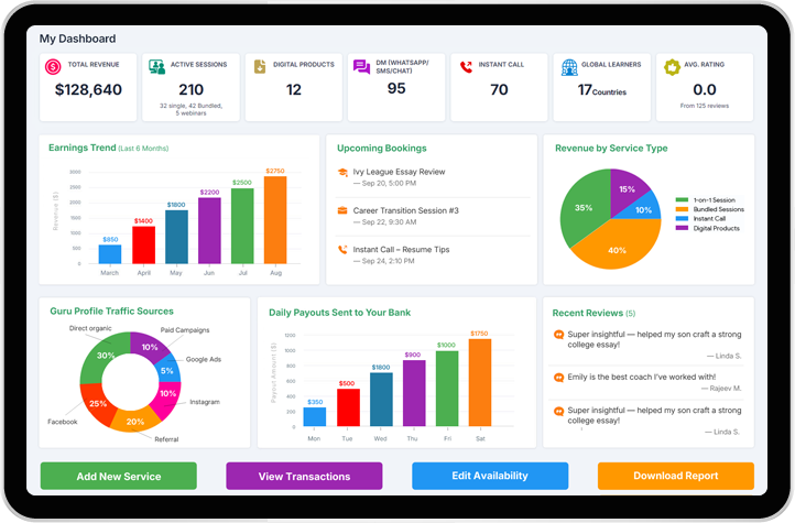 Everything you need to manage your business in one place - sessions, sales, payouts, and performance metrics.